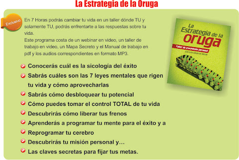 Datos LA ESTRATEGIA DE LA ORUGA [ Curso ] – Un Taller de Crecimiento Personal basado en la historia del gusano que quería volar Seminario en Video, Audio y PDF | 1 GB | 7 horas aprox | español neutro Cada año millones de personas comienzan el año pensando en hacer propósitos para cambiar sus vidas, para realizar sus sueños. ¿Quién no quisiera poder lograr alcanzar esa vida plena que quiere llevar, ese auto nuevo, esas vacaciones en la playa con los seres queridos, esa casa de los sueños? ¿Quién no ha deseado tener el tiempo para compartir con los que ama haciendo lo que ama hacer? Pero sin embargo, cada año empiezas haciendo propósitos que se olvidan unas semanas más tarde y te quedas atrapado en la misma rutina soñando con lo que pudo ser y no fue. Hasta que llega la celebración del nuevo año y la película vuelve a empezar…otra vez pronuncias esa frase…este año sí. La historia de la Oruga trata de un insecto casi insignificante que un día decidió que podía transformarse en lo que quería ser, y se convirtió en una hermosa mariposa. La transformación de la Oruga vino desde adentro y la tuya deber ser igual. Tú puedes transformar tu vida y la vida de los que te rodean si cambias tu forma de pensar y programas tu mente para tener éxito. Si la Oruga pudo, tú también lo puedes lograr. Está empezando el año, estás decidido a cambiar tu vida, estás cansado de hacer cada año lo mismo sin lograr resultados y has tomado la decisión de TRANSFORMARTE, de convertirte en una persona exitosa. Sin excusas, sin quejas, SOLO TU eres responsable de tu destino. Tú tienes el control de tu vida y si logras hacer lo que hizo la oruga podrás transformarte en lo que siempre has querido ser… un ser exitoso. Este seminario de LA ESTRATEGIA DE LA ORUGA ya ha cambiado la vida de centenares de personas que lo han tomado. El taller de LA ESTRATEGIA DE LA ORUGA es SOLO para personas que quieran transformarse. Solo si quieres cambiar tu mentalidad y empezar a pensar como piensan las personas exitosas, debes tomar este programa de de LA ESTRATEGIA DE LA ORUGA, de lo contrario sigue atrapado en ese círculo vicioso de programar tus propósitos de comienzo de año que terminas olvidando antes de DESCARGAS